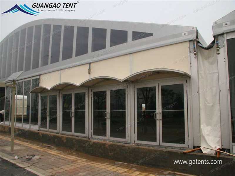 La pared de vidrio puede proporcionar un mejor ambiente interior de la carpa, ya que está llena de luz, es resistente a la intemperie y controla mejor la temperatura interior, que es su hermosa apariencia. Muchos muros cortina de vidrio están comenzando a venir con colores para una mejor protección UV.