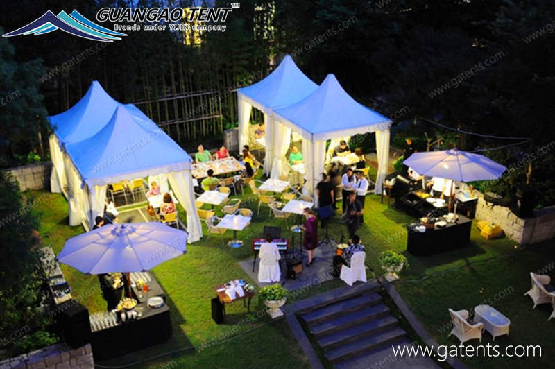 Las carpas pagoda son ampliamente utilizadas en depósitos temporales, fábricas, construcciones temporales, carpas de exhibición, carpas de construcción, socorro de emergencia, etc.